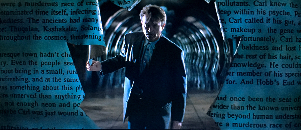 John Carpenter’s In the Mouth of Madness (1995) represents one of the last horror movies by the acclaimed director, who only worked on five more feature films of various genres up until the current day. The film itself, though barely profitable (IMDB), would go on to gather critical and cult praise, including being considered one of the top films of its year by the Cahier du Cinema (Johnson). The film follows the investigation by John Trent (Sam Neill) into the disappearance of the reclusive horror writer Sutter Kane (Jurgen Prochnow), who is the most widely published and read author on the planet. Kane’s publishing company is expecting his final book, and sends Trent and Kane’s editor Linda Styles (Julie Carmen) to attempt to find the whereabouts of the writer. When Trent finds a map that leads to the fictional town represented in Kane’s writings, he believes that his investigation is a part of an elaborate scam by the publishing company. After driving to the location, his stay in the town of “Hobb’s End” becomes increasingly weird, as events and characters from Kane’s work begin to present themselves as reality. After escaping the fictional world of Kane’s writing, Trent hopes to find himself back himself back in the familiar surroundings of New York City, only to learn that the horrific power in Kane’s writing has begun to infect the reality of the world. As a horror film, In the Mouth of Madness expresses several paradoxes throughout its duration. While this process takes place within the film’s story as monsters assert themselves into the reality of the main characters, it also is represented through the use of conflicting narrative spaces within the film’s diegesis. A noticeable visual pattern signals a shift in setting as characters shift from one narrative space to another. The narrative space of the film becomes increasingly abstract and porous, as characters shift between these spaces, sometimes without their own knowledge or consent. This transference comes to a climax as Trent is seen running on an abstract bridge away from the fictional-turn-real horrors of Kane’s writing. As exemplified through an examination of these transitions and abstract spaces, In the Mouth of Madness’s use of paradoxes and their tensions within its diegesis creates a sense of disorientation for the audience through its narrative immersion.